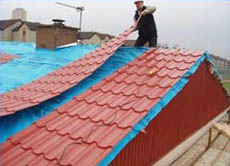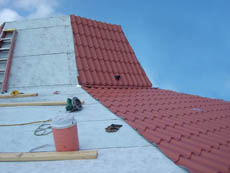 Обрешетка производится с расстоянием между осями нижней и второй рейки – 280 мм, между осями последующих реек – 350 мм. Крюки, на которые крепится желоб водосточной системы, рекомендуется устанавливать до того как будет начат монтаж металлочерепицы. Крюки крепятся оцинкованными шурупами. Листы металлочерепицы закрепляются на обрешетке при помощи шурупов-саморезов с шайбой 35х4,8 мм. Саморезы распределяются исходя из норматива – 6 штук на 1 м2. Располагаются точки крепления в углублении вертикальной волны и под горизонтальной волной листа металлочерепицы. Для обеспечения большей плотности примыкания листов металлочерепицы в местах боковых перехлестов шурупы при закреплении располагают под углом к поверхности металлочерепицы. Примыкание листов металлочерепицы к стене оформляется уголковым профилем. Изоляция антенн, электрических кабелей и труб вентиляции диаметром 75 – 150 мм выполняется при помощи резиновой муфты. Муфта срезается до нужного диаметра, натягивается на трубу и прикрепляется к листу металлочерепицы саморезами. Место стыка дополнительно обрабатывается силиконовым герметиком.